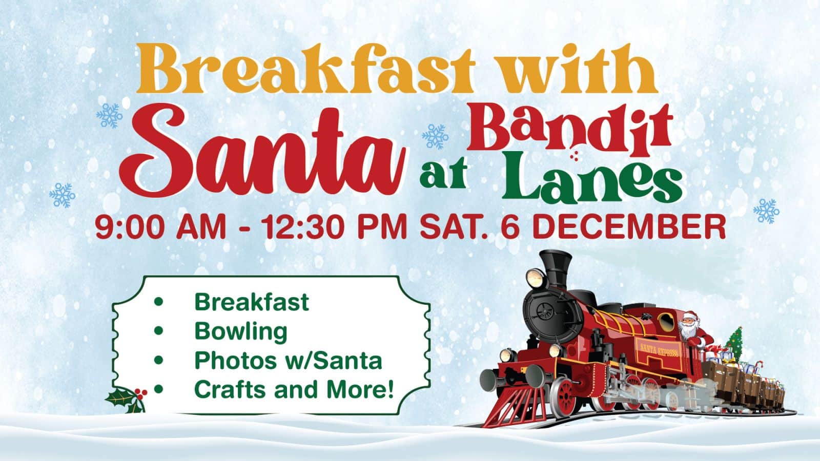 - Ticket includes breakfast, bowling, holiday crafts, cookie decoration, photos with Santa, and MORE!