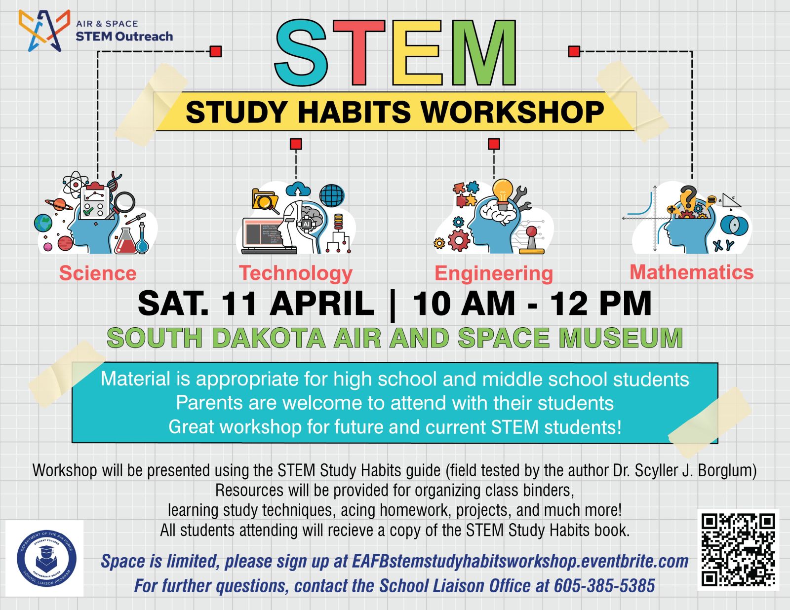 Join us at the South Dakota Air and Space Museum for the STEM study habits workshop. The workshop will be presented using the STEM Study Habits Guide. Resources will be provided for organizing class binders, learning study techniques, acing homework, projects, and much more!