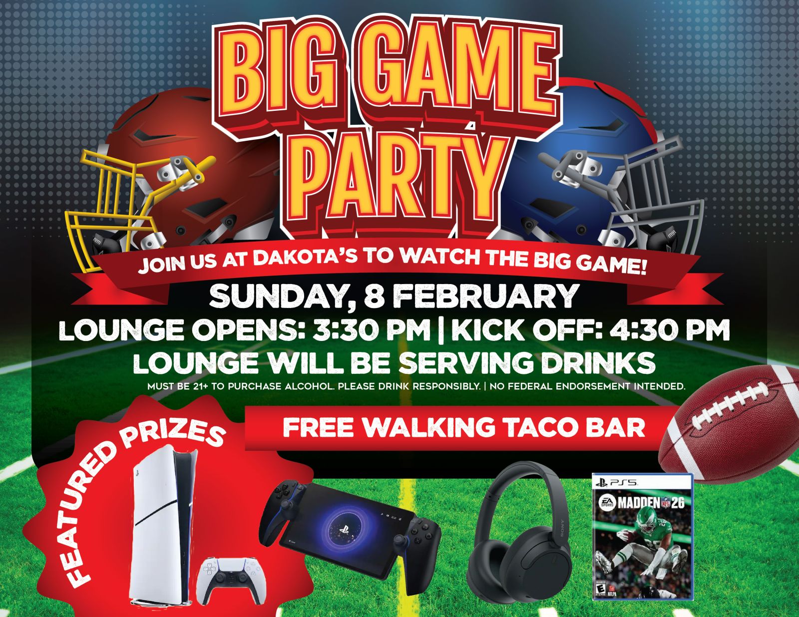 8 February Lounge opens at 3:30 PM Kick off at 4:30 PM Lounge will be serving drinks Must be 21+ to purchase alcohol. Please drink responsibly Join us at Dakota's […] |