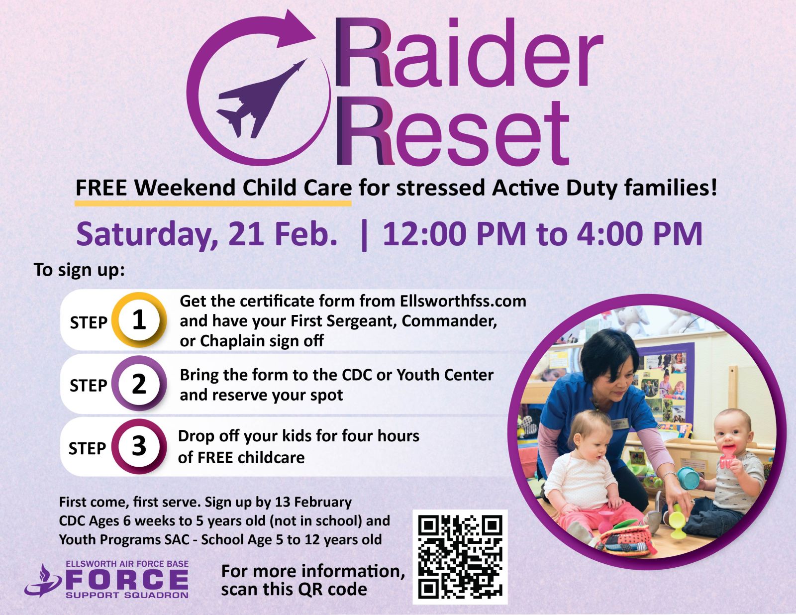 21 February 12:00 PM to 4:00 PM FREE weekend child care for stressed active duty families! Visit https://ellsworthfss.com/raider-reset/ for more information on how to register. |