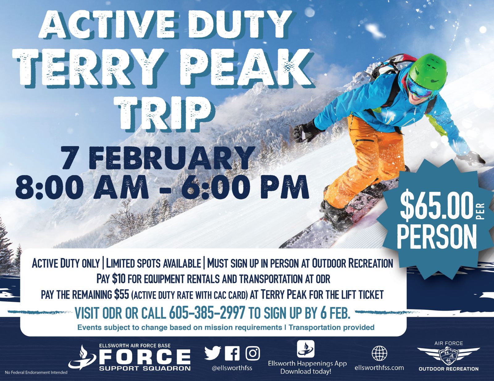 7 February 8 AM to 6 PM Active Duty Only | Limited spots available | Must sign up in person at Outdoor Rec Total $65 Pay $10 for equipment rentals […]
