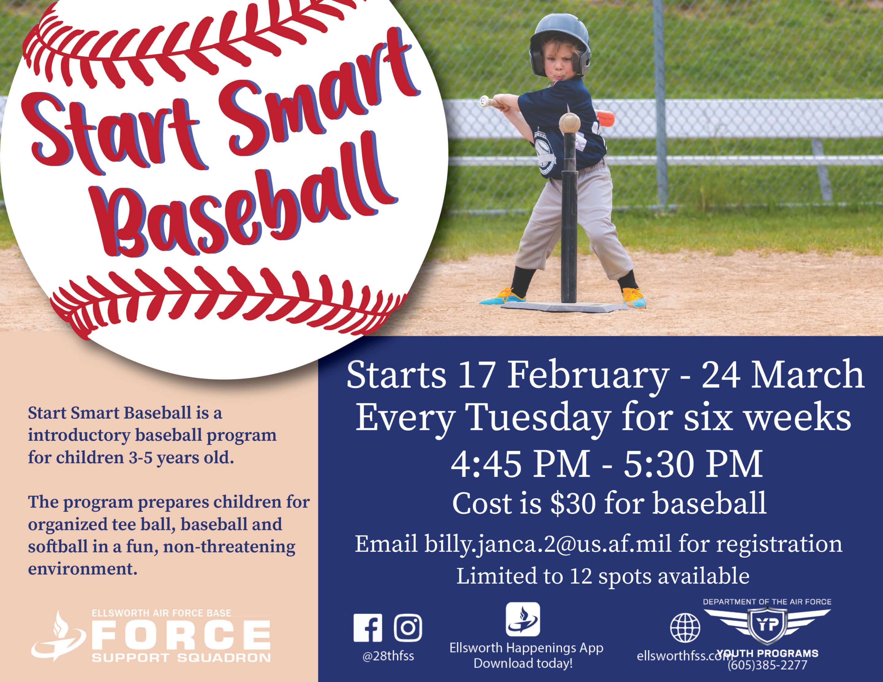 League starts 17 February and goes through 24 March Every Tuesday for six weeks 4:45 PM to 5:30 PM $30 Smart start baseball is an introductory baseball program for children […] |