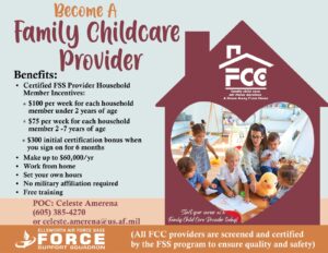 Child Care for Permanent Change of Station – Childcare for PSC is a program through the Airman & Family Readiness Center that provides for up to 20 hours of free childcare per child for families that are leaving or being stationed here at Ellsworth AFB. When the certificate is issued from A&FRC, parents can call any FCC Provider to schedule the childcare. Please inform the Provider you are using PSC care and give her the certificate.